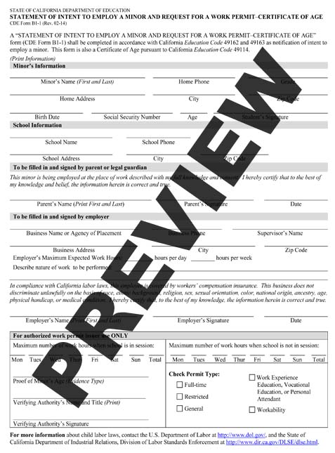 Minors Statement Of Intent To Employ And Request For Work Permit Form B1 1 Hrcalifornia