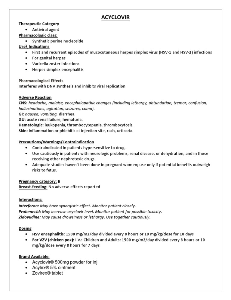 Acyclovir drug class. Click card to see definition. These drugs are often used to treat similar conditions. 6-11 years 800 mg 4 times daily for 5 days.
